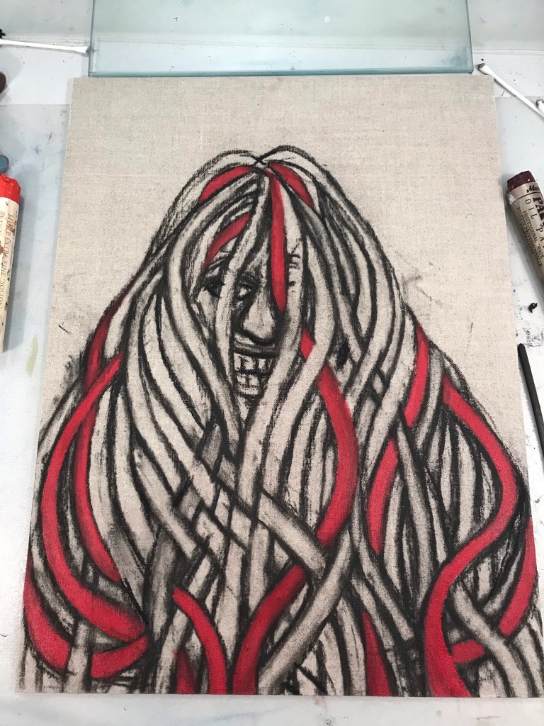 Thankfully I now have a studio at home so it was time to sanctify this canvas with some paint, if I did not put some on it then I would be looking at the same image for months whilst I decided what colours to paint it.