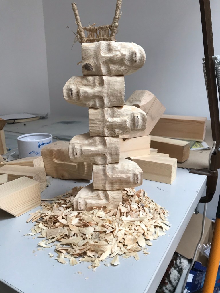 This piece is slowly going in the right direction I only have four more heads to carve. The inclusion of the wood chips also add to it.