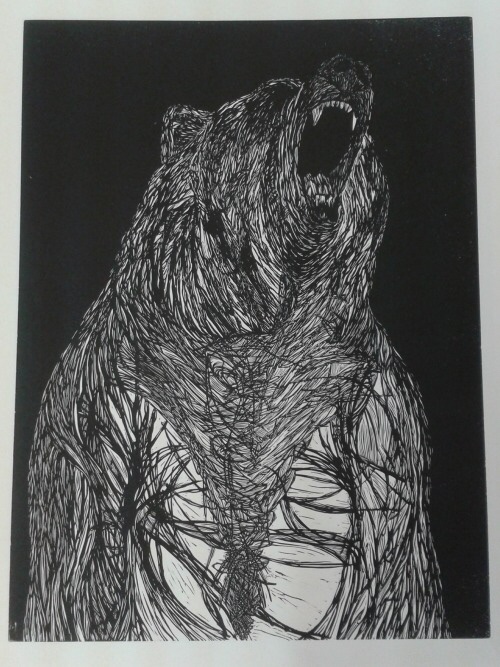 The Hydrogen Man print was a big influence as can be seen in my Frustrated Bear print, this was designed and cut when my late wife and I were going through a very hard time with the cancer. I was truly frustrated and angry with the world and found solace and inspiration from Baskin’s work. I could relate to Baskin’s subject matter, the idea of a twisted eviscerated body, drawn of many lines, showing the tension within. In many ways I was able to achieve this with the Frustrated Bear.