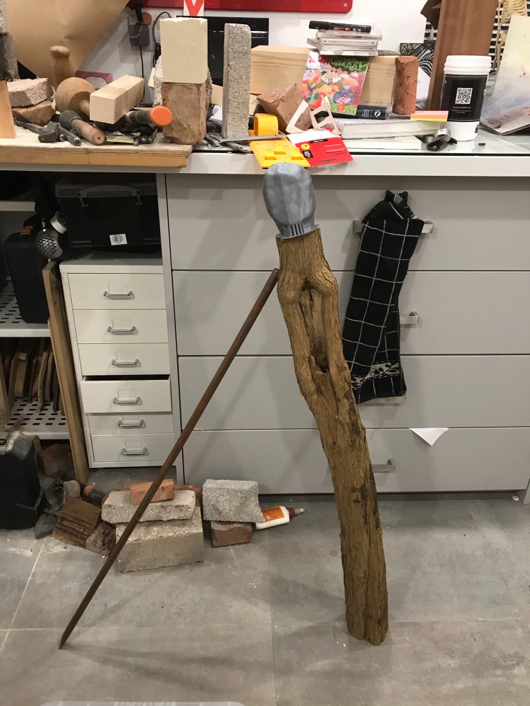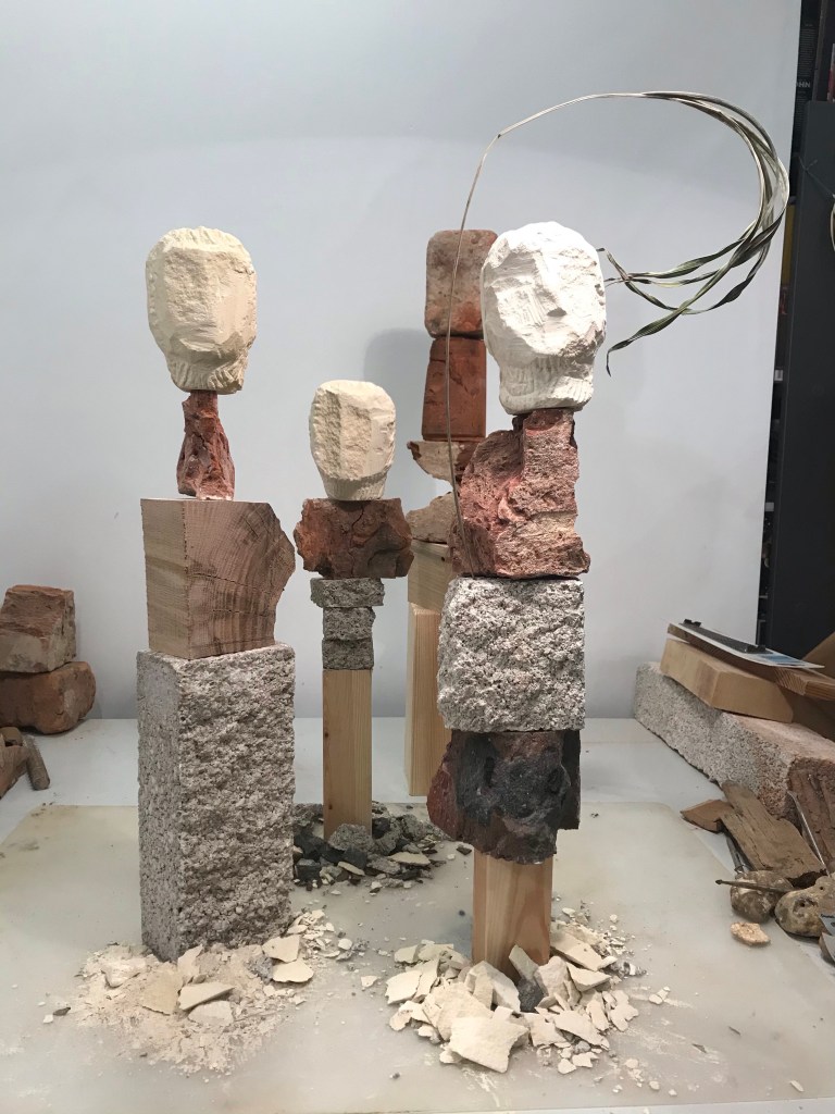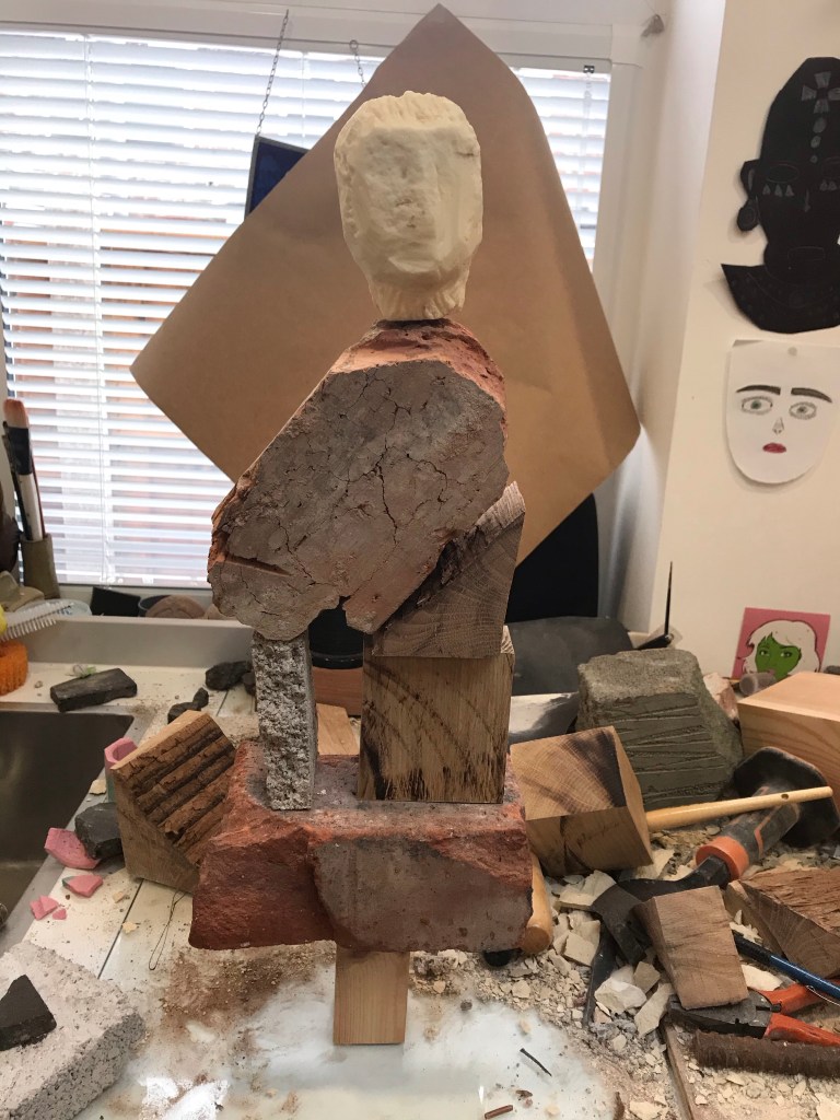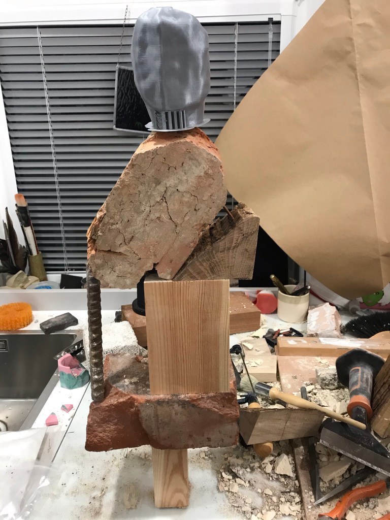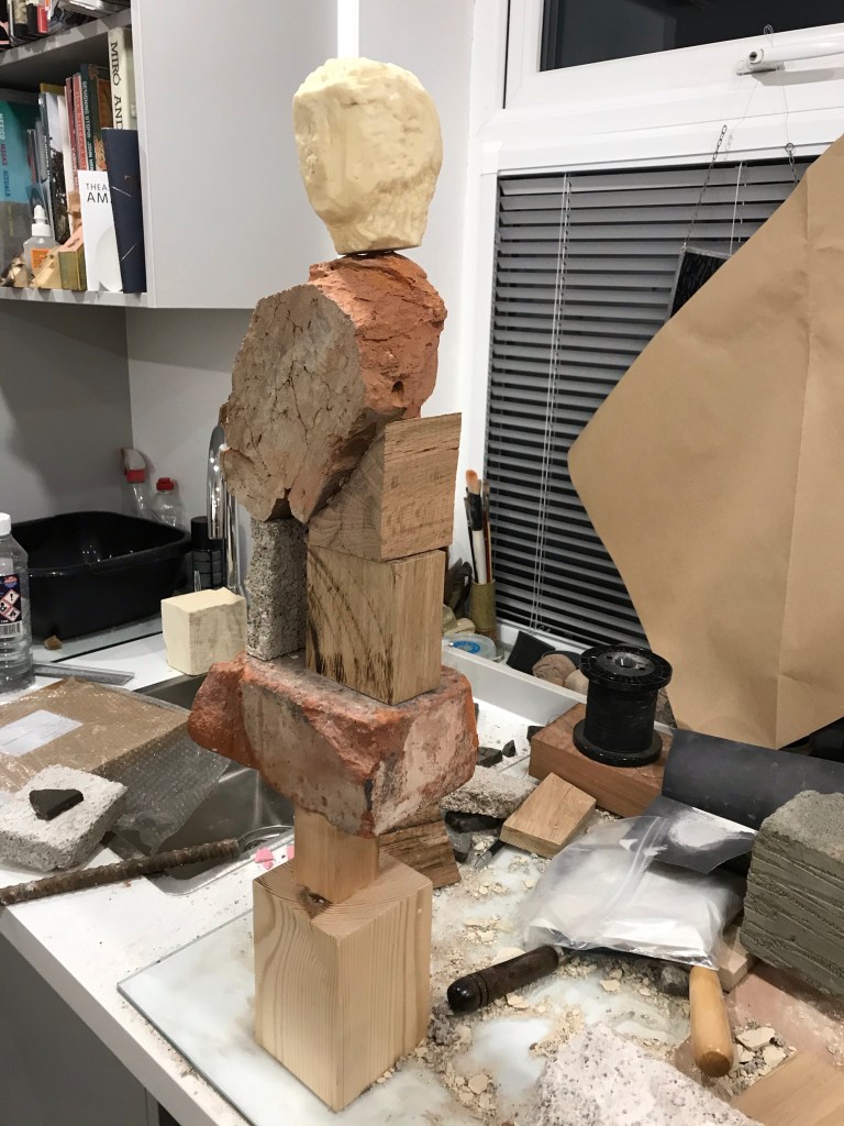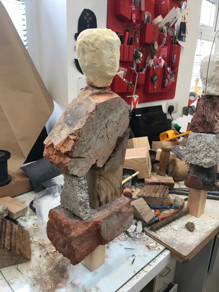 So this sculpture has changed again but I feel that this will be its final iteration for now. The only part that is keeping it from destroying itself is the wooden wedge. Talking about destruction this toppled down this morning causing a domino chain reaction of other sculptures going over, if only I had filmed it. Also the head is a resin cast which I am rather happy with . Just look at me and I will crumble . . Mixed media brick, oak , concrete block and resin . . .