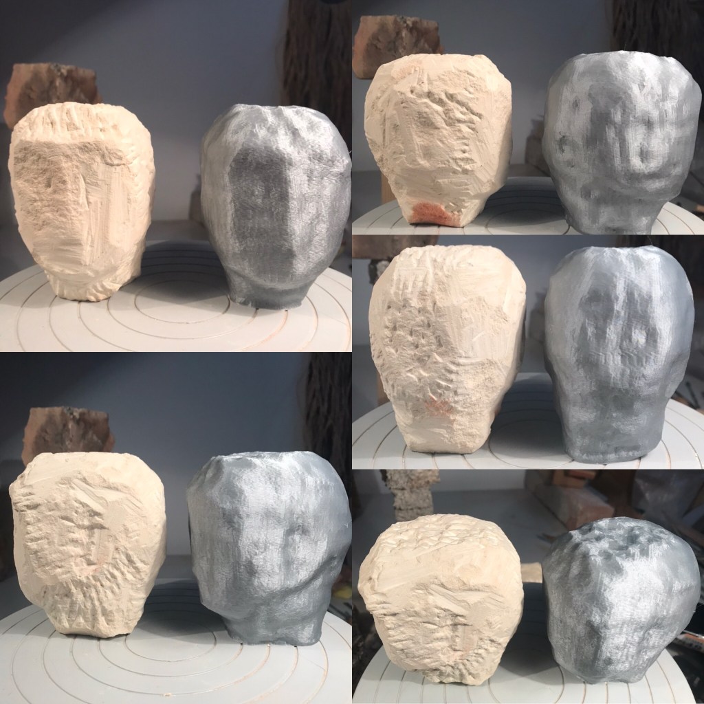 The translation of the chalk, charcoal and ink drawings that I do of the set up sculptures. In all these cases something of the original has been lost yet it’s essence is still there. The next part of this journey will start next week, when I am going to vas a one piece silicone mould of today’s printed head, I can then start a batch production of heads in different materials that can then be used as components for other sculptures.