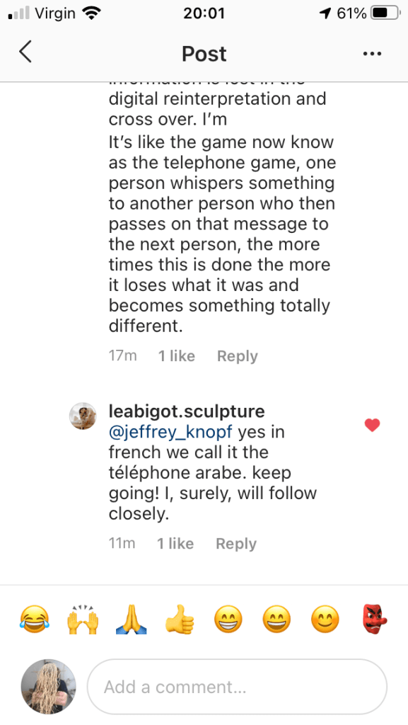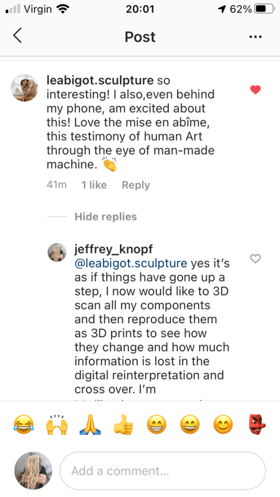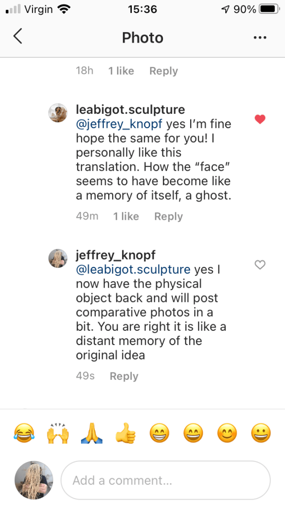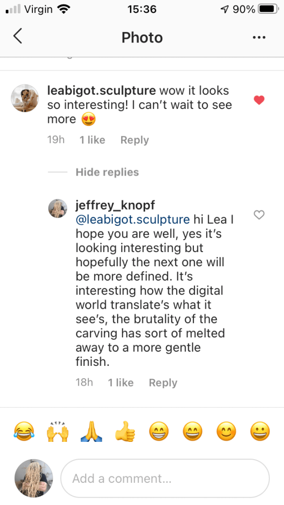So here is the latest Instagram conversation with Lea Bigot, around the above 3D printed head. I really like how we are forming a dialogue around the process and the effects that are coming from printing this stone head.