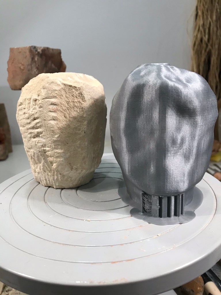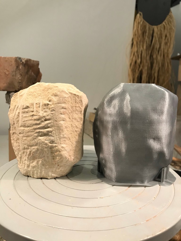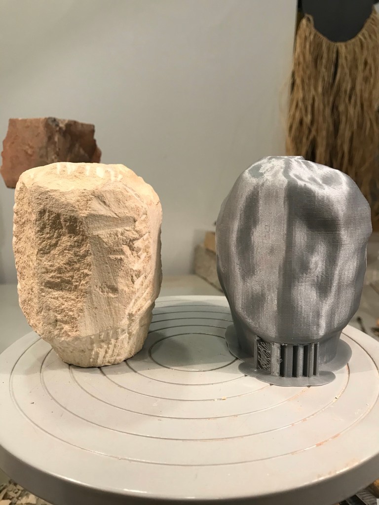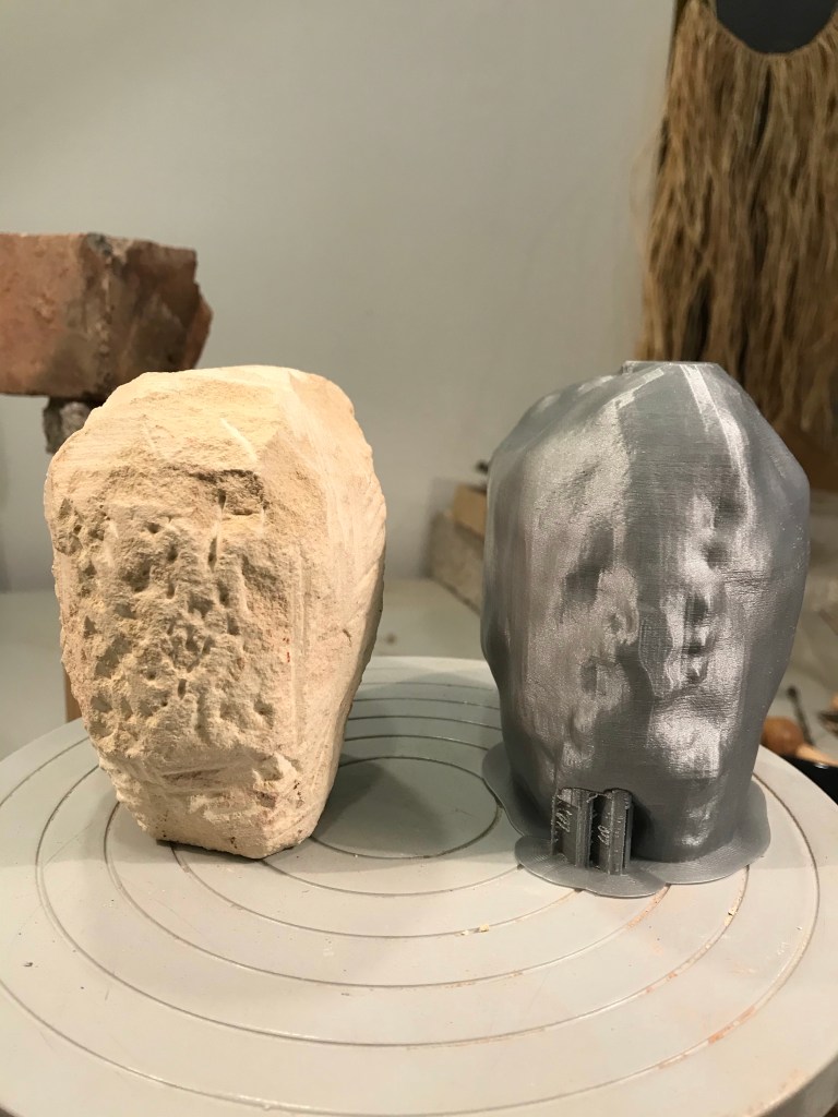 Today I was able to collect my current 3D printed head from university. The photos show the differences between the original and printed piece, and as @leabigot.sculpture said in a previous conversation what I have ended up with is a ghost like memory of the original. All the textures and scars from working the stone I are gone, what is left is an organic yet alien object. I also like the little additions to the print, these structures would normally be cut away and discarded, their only use being to support the model while it is printing. In this case I feel they should remain as the help add another dimension to the sculpted piece. As can be guessed I’m rather excited by these developments as I feel I am on the cusp of something new, a new visual and sculptural language, using technology to add to and make us reevaluate what is in front of us.