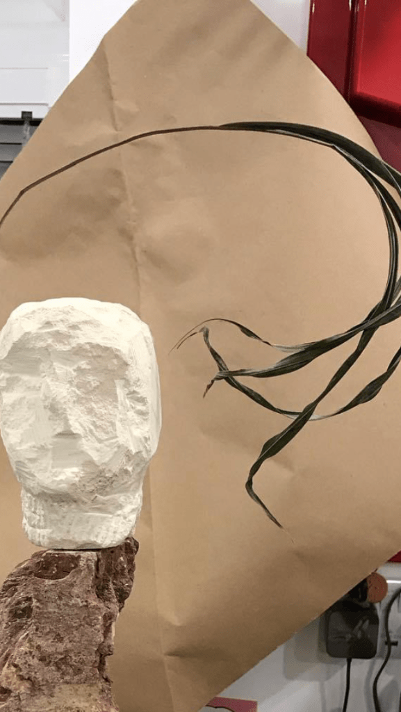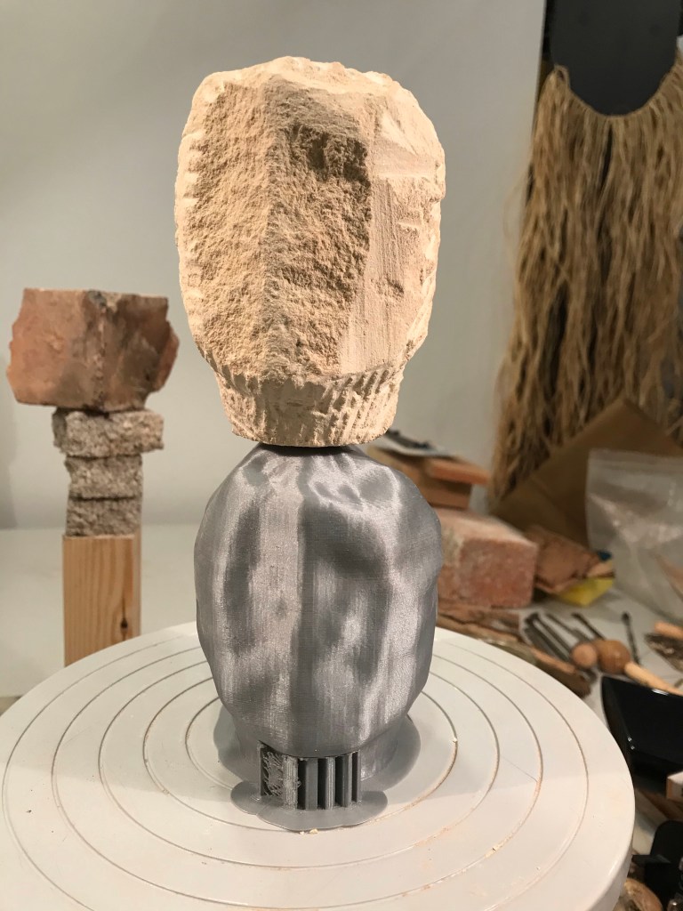 This is where the 3D printed head becomes interesting. It has a strange yet strong fragility to its structure. A solid yet not fully formed solid. As can be seen it is Strong enough for a heavy piece of stone to rest on it and create a new sculptural form. . . . . . . . .